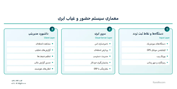 معماری یک نرم افزار حضور و غیاب ابری معمولاً از سه لایه تشکیل شده است: